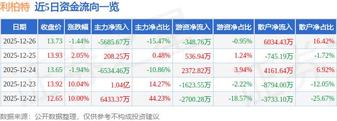 证券之星消息,截至2025年12月26日收盘,利柏特(605167)报收于13.73元,下跌1.44%,换手率5.9%,成交量26.51万手,成交额3.68亿元。