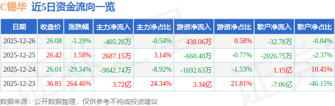 证券之星消息,截至2025年12月26日收盘,C锡华(603248)报收于26.08元,下跌1.29%,换手率41.31%,成交量28.63万手,成交额7.56亿元。
