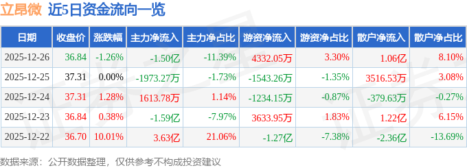 证券之星消息,截至2025年12月26日收盘,立昂微(605358)报收于36.84元,下跌1.26%,换手率5.28%,成交量35.42万手,成交额13.14亿元。