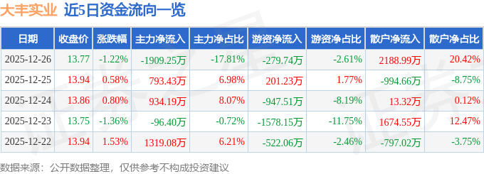 12月26日的资金流向数据方面,主力资金净流出1909.25万元,占总成交额17.81%,游资资金净流出279.74万元,占总成交额2.61%,散户资金净流入2188.99万元,占总成交额20.42%。