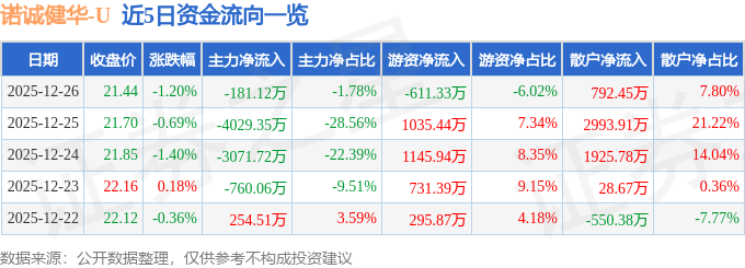 证券之星消息,截至2025年12月26日收盘,诺诚健华(688428)报收于21.44元,下跌1.2%,换手率1.76%,成交量4.73万手,成交额1.02亿元。