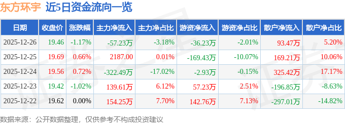 证券之星消息,截至2025年12月26日收盘,东方环宇(603706)报收于19.46元,下跌1.17%,换手率0.48%,成交量9184.0手,成交额1798.8万元。