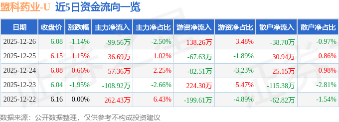 证券之星消息,截至2025年12月26日收盘,盟科药业(688373)报收于6.08元,下跌1.14%,换手率1.24%,成交量6.51万手,成交额3976.26万元。