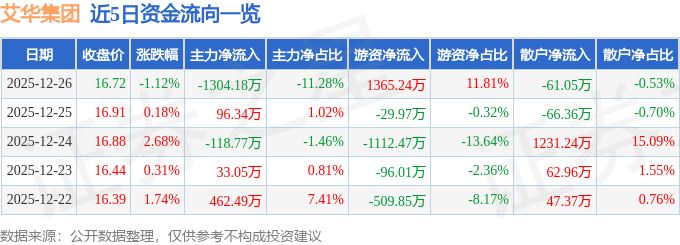 证券之星消息,截至2025年12月26日收盘,艾华集团(603989)报收于16.72元,下跌1.12%,换手率1.71%,成交量6.82万手,成交额1.16亿元。