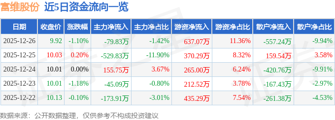 证券之星消息,截至2025年12月26日收盘,富维股份(600742)报收于9.92元,下跌1.1%,换手率0.76%,成交量5.62万手,成交额5606.21万元。