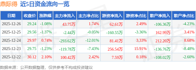 12月26日的资金流向数据方面,主力资金净流入43.75万元,占总成交额1.74%,游资资金净流入62.61万元,占总成交额2.49%,散户资金净流出106.36万元,占总成交额4.23%。