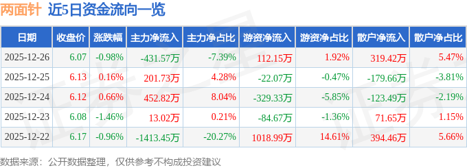 证券之星消息,截至2025年12月26日收盘,两面针(600249)报收于6.07元,下跌0.98%,换手率1.74%,成交量9.56万手,成交额5838.7万元。