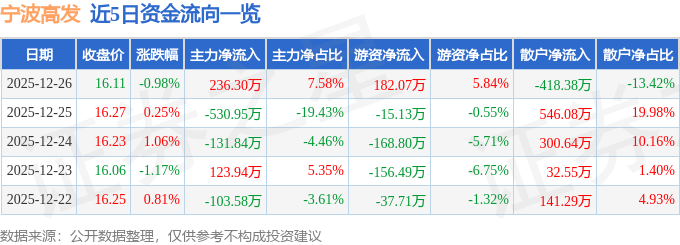 证券之星消息,截至2025年12月26日收盘,宁波高发(603788)报收于16.11元,下跌0.98%,换手率0.86%,成交量1.93万手,成交额3117.05万元。