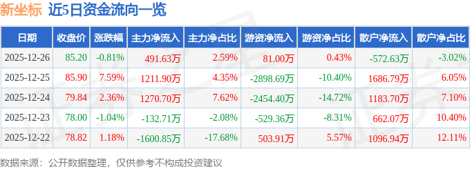 证券之星消息,截至2025年12月26日收盘,新坐标(603040)报收于85.2元,下跌0.81%,换手率1.62%,成交量2.2万手,成交额1.89亿元。