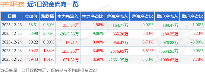 证券之星消息,截至2025年12月26日收盘,中邮科技(688648)报收于58.51元,下跌0.8%,换手率4.35%,成交量3.03万手,成交额1.79亿元。