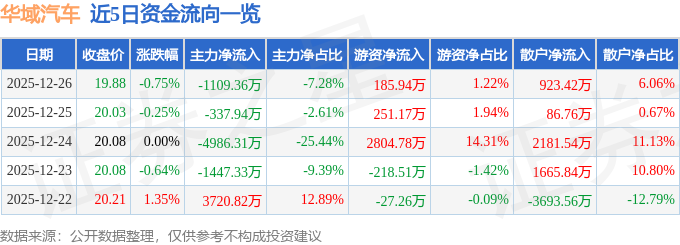 证券之星消息,截至2025年12月26日收盘,华域汽车(600741)报收于19.88元,下跌0.75%,换手率0.24%,成交量7.64万手,成交额1.52亿元。