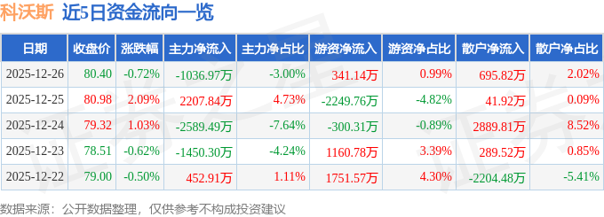 证券之星消息,截至2025年12月26日收盘,科沃斯(603486)报收于80.4元,下跌0.72%,换手率0.75%,成交量4.28万手,成交额3.45亿元。