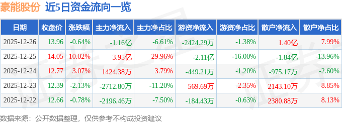 证券之星消息,截至2025年12月26日收盘,豪能股份(603809)报收于13.96元,下跌0.64%,换手率13.41%,成交量123.37万手,成交额17.53亿元。