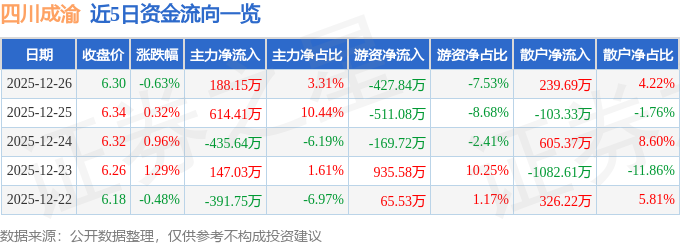 证券之星消息,截至2025年12月26日收盘,四川成渝(601107)报收于6.3元,下跌0.63%,换手率0.42%,成交量9.0万手,成交额5680.98万元。