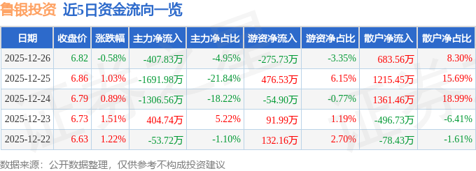 证券之星消息,截至2025年12月26日收盘,鲁银投资(600784)报收于6.82元,下跌0.58%,换手率1.79%,成交量12.07万手,成交额8234.94万元。