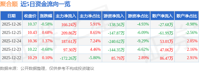 证券之星消息,截至2025年12月26日收盘,聚合顺(605166)报收于10.37元,下跌0.58%,换手率0.86%,成交量2.7万手,成交额2813.16万元。