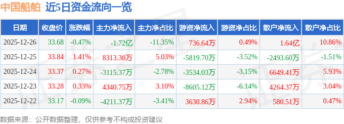 证券之星消息,截至2025年12月26日收盘,中国船舶(600150)报收于33.68元,下跌0.47%,换手率0.6%,成交量44.91万手,成交额15.14亿元。