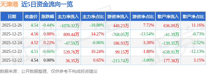 证券之星消息,截至2025年12月26日收盘,天津港(600717)报收于4.54元,下跌0.44%,换手率0.43%,成交量12.52万手,成交额5701.18万元。