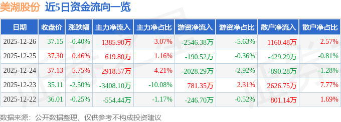 证券之星消息,截至2025年12月26日收盘,美湖股份(603319)报收于37.15元,下跌0.4%,换手率3.58%,成交量12.13万手,成交额4.52亿元。
