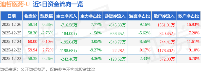 证券之星消息,截至2025年12月26日收盘,迪哲医药(688192)报收于58.14元,下跌0.38%,换手率0.35%,成交量1.59万手,成交额9225.51万元。
