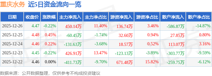证券之星消息,截至2025年12月26日收盘,重庆水务(601158)报收于4.47元,下跌0.22%,换手率0.18%,成交量8.82万手,成交额3947.3万元。