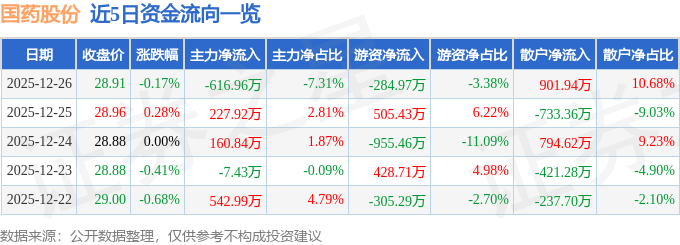 证券之星消息,截至2025年12月26日收盘,国药股份(600511)报收于28.91元,下跌0.17%,换手率0.53%,成交量2.92万手,成交额8443.12万元。