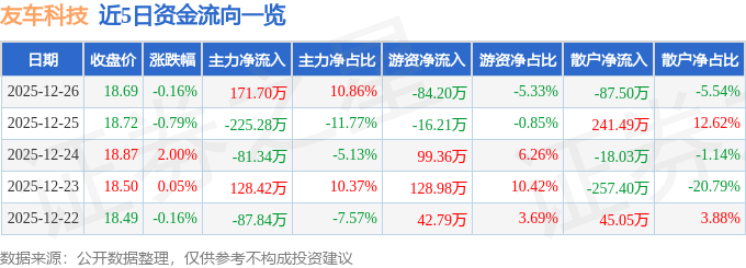 证券之星消息,截至2025年12月26日收盘,友车科技(688479)报收于18.69元,下跌0.16%,换手率1.36%,成交量8460.0手,成交额1580.6万元。