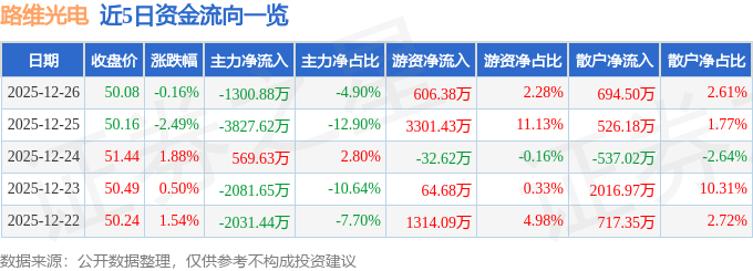 证券之星消息,截至2025年12月26日收盘,路维光电(688401)报收于50.08元,下跌0.16%,换手率2.71%,成交量5.23万手,成交额2.66亿元。