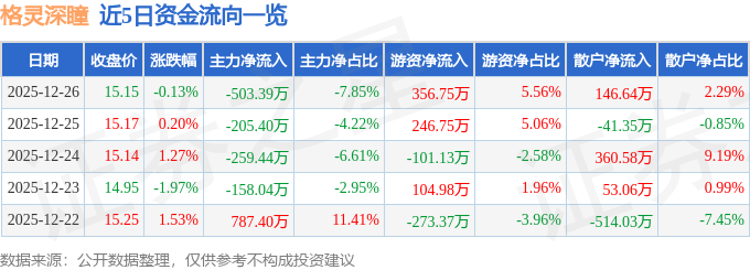 证券之星消息,截至2025年12月26日收盘,格灵深瞳(688207)报收于15.15元,下跌0.13%,换手率1.63%,成交量4.22万手,成交额6412.38万元。