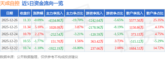证券之星消息,截至2025年12月26日收盘,天成自控(603085)报收于11.33元,下跌0.09%,换手率4.87%,成交量19.33万手,成交额2.2亿元。