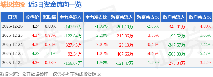 证券之星消息,截至2025年12月26日收盘,城投控股(600649)报收于4.34元,上涨0.0%,换手率0.7%,成交量17.44万手,成交额7592.85万元。