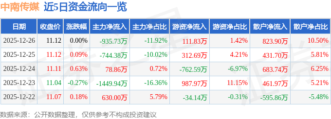 证券之星消息,截至2025年12月26日收盘,中南传媒(601098)报收于11.12元,上涨0.0%,换手率0.39%,成交量7.06万手,成交额7850.18万元。