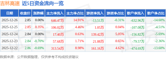 证券之星消息,截至2025年12月26日收盘,吉林高速(601518)报收于2.85元,上涨0.0%,换手率0.8%,成交量15.19万手,成交额4336.36万元。