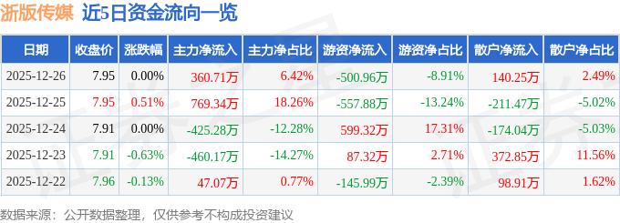 证券之星消息,截至2025年12月26日收盘,浙版传媒(601921)报收于7.95元,上涨0.0%,换手率0.32%,成交量7.08万手,成交额5622.89万元。