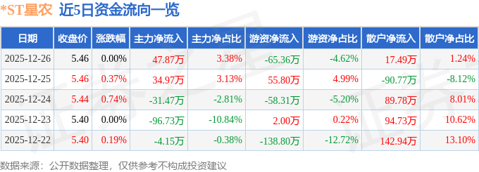 证券之星消息,截至2025年12月26日收盘,*ST星农(603789)报收于5.46元,上涨0.0%,换手率1.0%,成交量2.59万手,成交额1415.44万元。