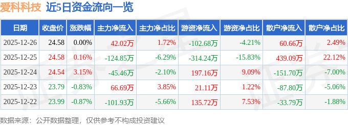 12月26日的资金流向数据方面,主力资金净流入42.02万元,占总成交额1.72%,游资资金净流出102.68万元,占总成交额4.21%,散户资金净流入60.66万元,占总成交额2.49%。