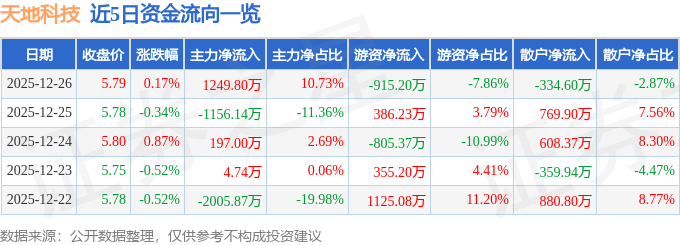 证券之星消息,截至2025年12月26日收盘,天地科技(600582)报收于5.79元,上涨0.17%,换手率0.49%,成交量20.11万手,成交额1.16亿元。
