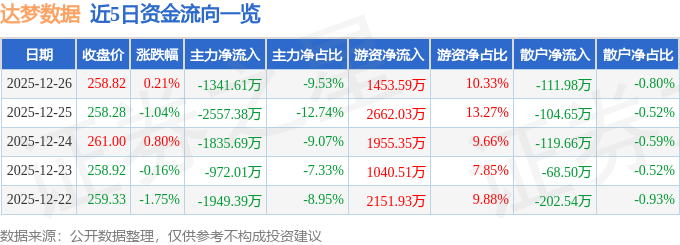 证券之星消息,截至2025年12月26日收盘,达梦数据(688692)报收于258.82元,上涨0.21%,换手率0.74%,成交量5435.0手,成交额1.41亿元。