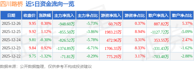 证券之星消息,截至2025年12月26日收盘,四川路桥(600039)报收于9.95元,上涨0.3%,换手率0.19%,成交量16.62万手,成交额1.65亿元。