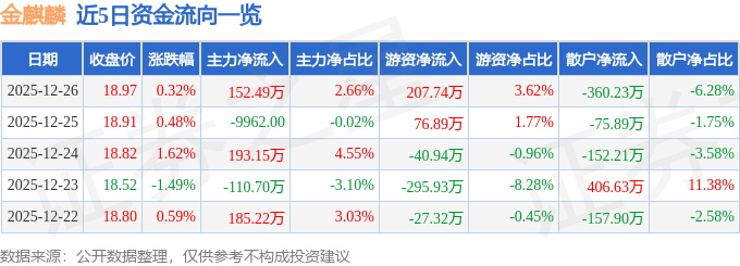 12月26日的资金流向数据方面,主力资金净流入152.49万元,占总成交额2.66%,游资资金净流入207.74万元,占总成交额3.62%,散户资金净流出360.23万元,占总成交额6.28%。
