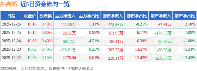 证券之星消息,截至2025年12月26日收盘,外高桥(600648)报收于10.16元,上涨0.4%,换手率0.19%,成交量2.15万手,成交额2177.59万元。