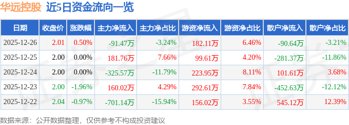 证券之星消息,截至2025年12月26日收盘,华远控股(600743)报收于2.01元,上涨0.5%,换手率0.6%,成交量14.07万手,成交额2819.45万元。