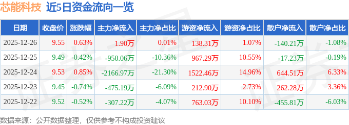 证券之星消息,截至2025年12月26日收盘,芯能科技(603105)报收于9.55元,上涨0.63%,换手率2.7%,成交量13.52万手,成交额1.3亿元。