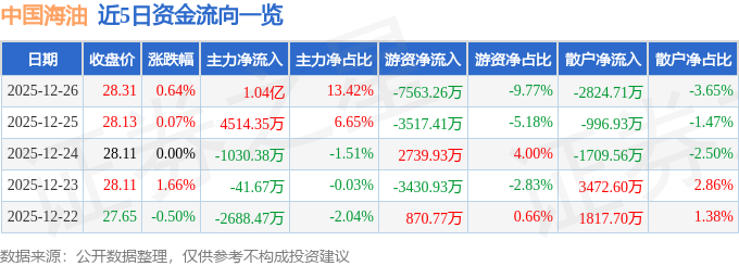 证券之星消息,截至2025年12月26日收盘,中国海油(600938)报收于28.31元,上涨0.64%,换手率0.91%,成交量27.35万手,成交额7.74亿元。
