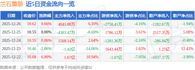 证券之星消息,截至2025年12月26日收盘,兰石重装(603169)报收于10.62元,上涨0.66%,换手率4.78%,成交量62.45万手,成交额6.63亿元。