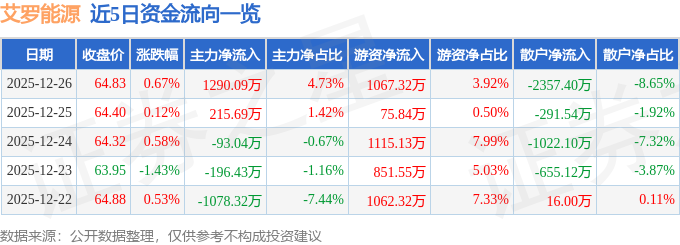 证券之星消息,截至2025年12月26日收盘,艾罗能源(688717)报收于64.83元,上涨0.67%,换手率4.26%,成交量4.17万手,成交额2.73亿元。