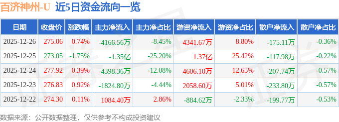 证券之星消息,截至2025年12月26日收盘,百济神州(688235)报收于275.06元,上涨0.74%,换手率1.57%,成交量1.8万手,成交额4.93亿元。