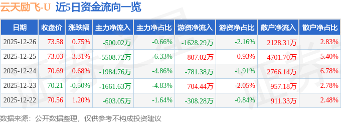 证券之星消息,截至2025年12月26日收盘,云天励飞(688343)报收于73.58元,上涨0.75%,换手率3.88%,成交量10.24万手,成交额7.53亿元。