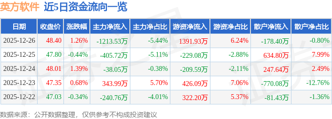 证券之星消息,截至2025年12月26日收盘,英方软件(688435)报收于48.4元,上涨1.26%,换手率9.78%,成交量4.61万手,成交额2.23亿元。