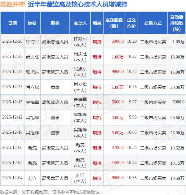 证券之星消息,根据12月26日市场公开信息、上市公司公告及交易所披露数据整理,苏盐井神(603299)最新董监高及相关人员股份变动情况:2025年12月26日公司高级管理人员许海军共增持公司股份5900.0股,占公司总股本为0.0008%。变动期间公司股价上涨0.19%,12月26日当日收盘报10.28元。